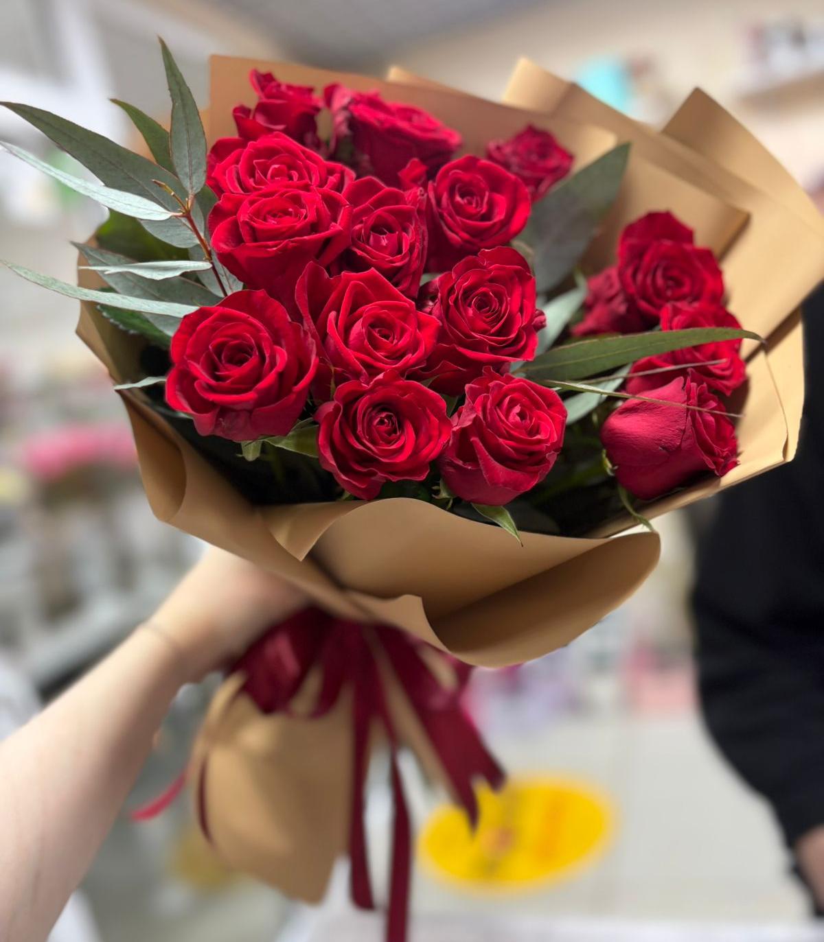 Букет из 15 роз (40-50м,2сорт) с эвкалиптом. В ассортименте разные цвета на выбор