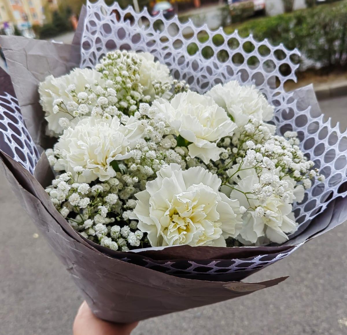 Букет из 7 белых диантусов с гипсофилой, в упаковке на выбор