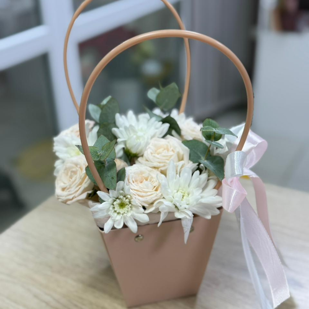 Хризантемы, кустовая роза и эвкалипт в коробочке