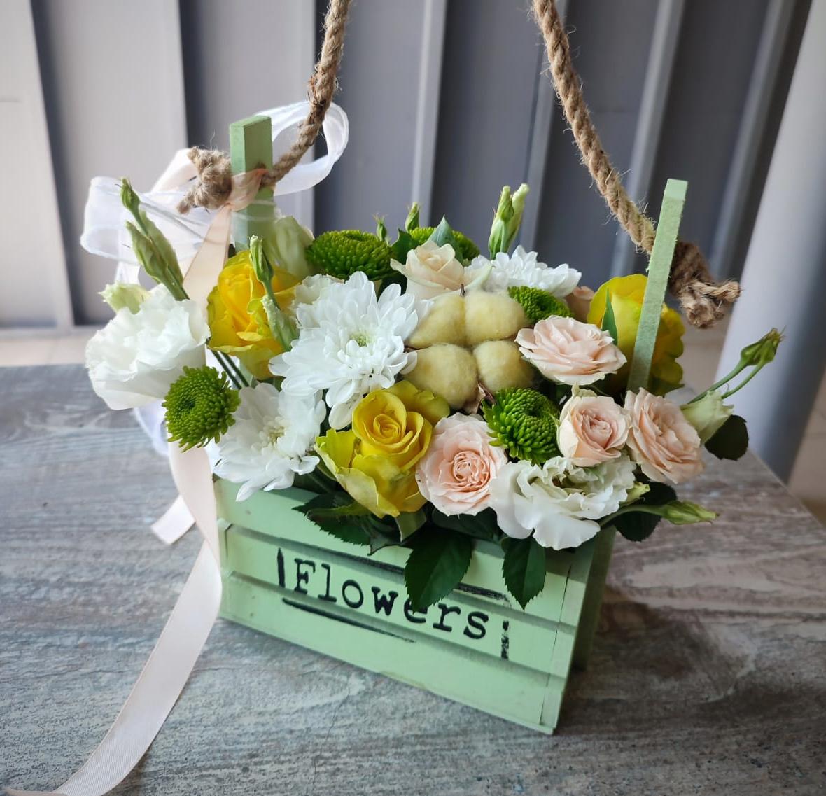 Композиция в деревянном ящике с желтыми розами, хризантемой и кремовой кустовой