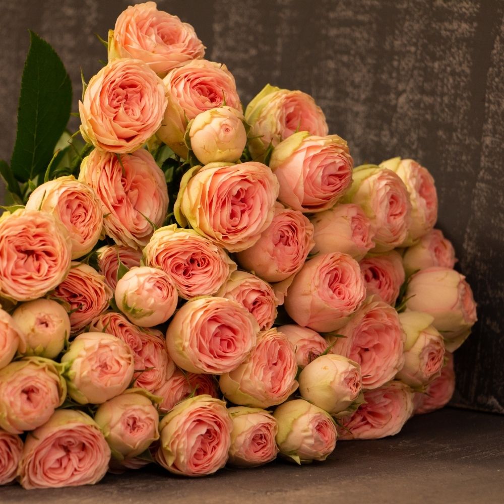 Цвет кустовой розы Грандмасс кетти перламутрово-розовый, с зеленоватым кроющим лепестком.