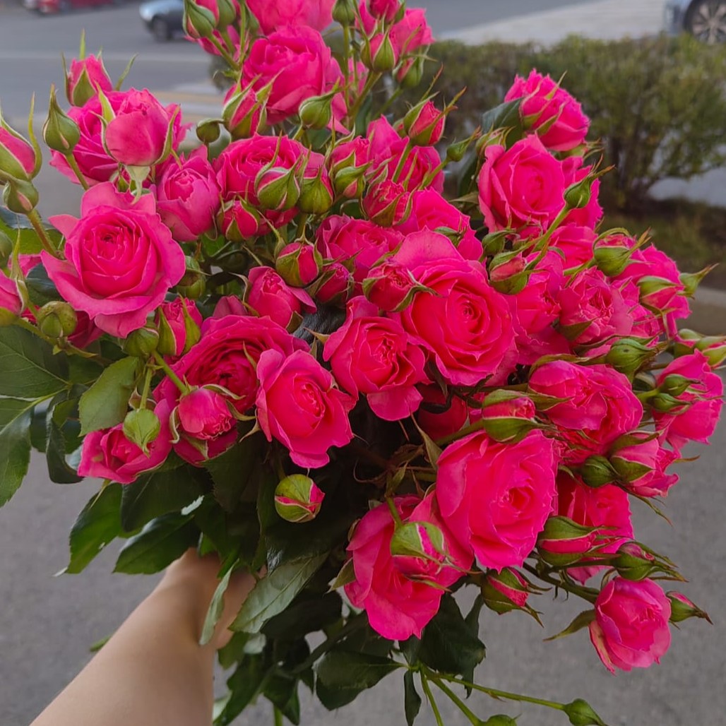 Кустовая роза с классическими по форме бутонами насыщенного розового цвета.