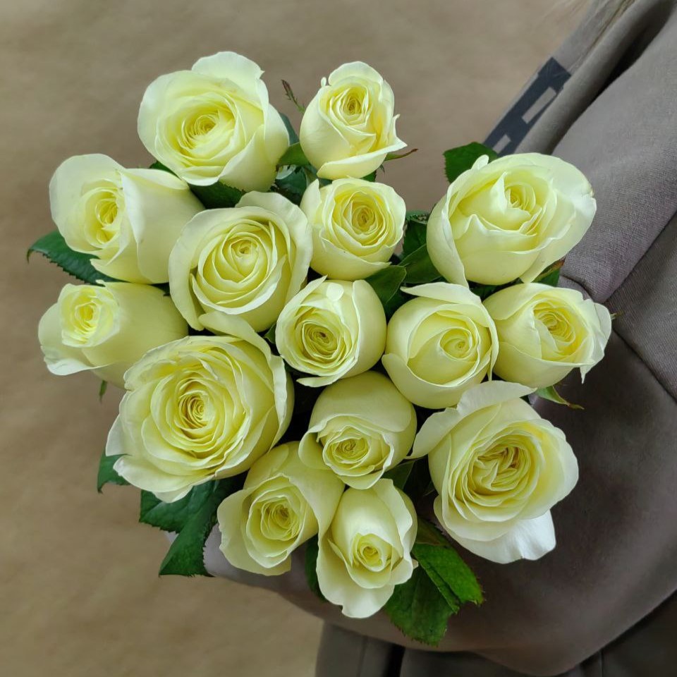 Безупречный утонченный бутон при раскрытии тёпло-молочного оттенка обрамлён роскошными зелёными листьями.