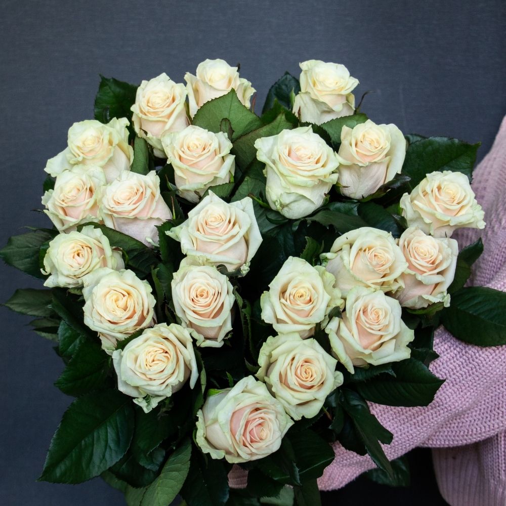 Сорт розы Савита цвета слоновой кости с легкой розовинкой в центре бутона. Кончики крайних лепестков зеленого цвета.